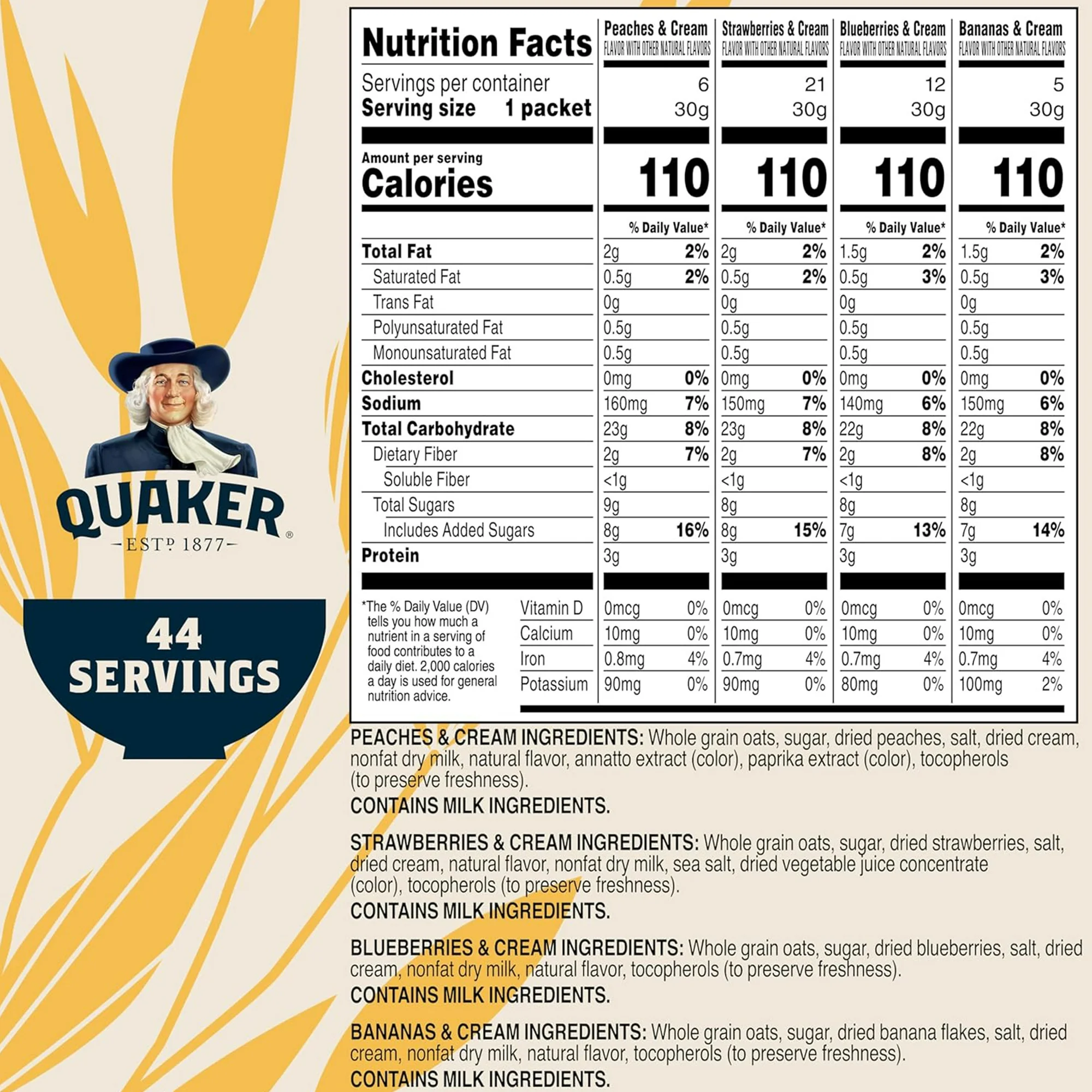 Instant Oatmeal Fruit & Cream Variety Pack by Quaker Oats offers a deliciously creamy and fruity start to your morning. Each packet combines the wholesome goodness of 100% whole grain oats with sweet fruit flavors and a smooth, creamy texture.