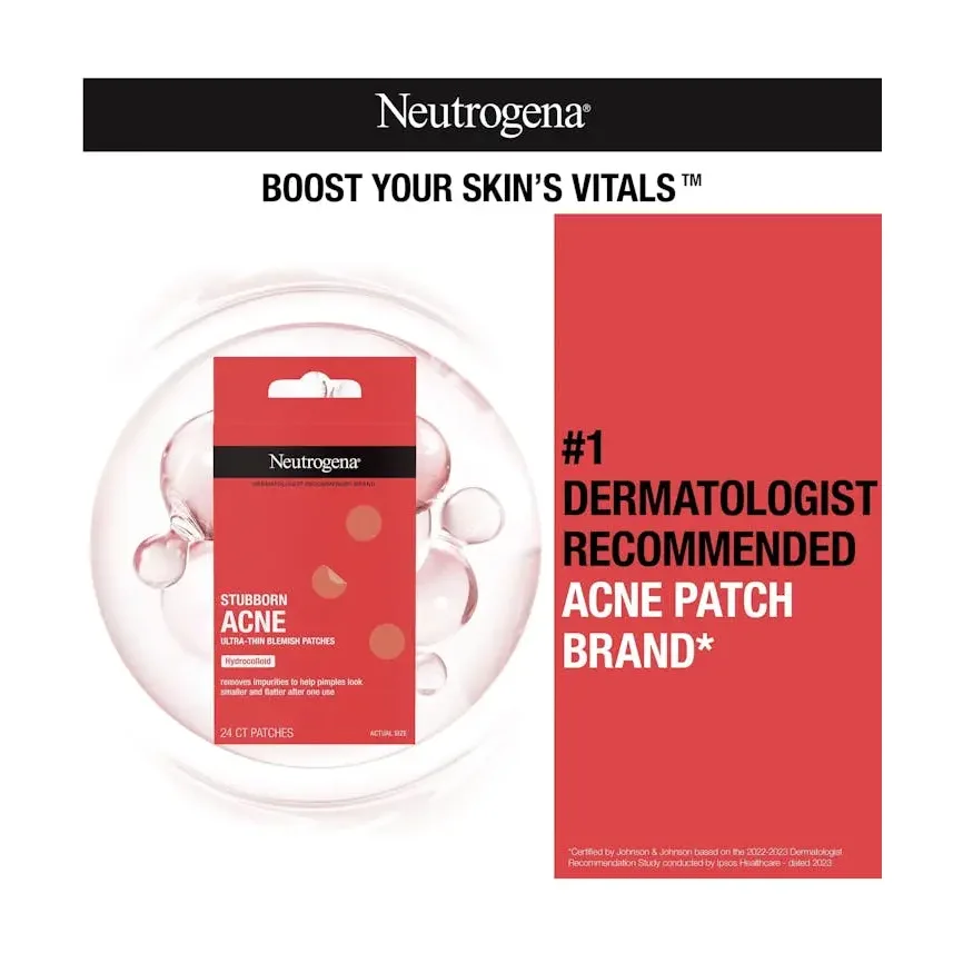 Stubborn Acne Pimple Patches by Neutrogena are ultra-thin hydrocolloid patches designed to visibly reduce the appearance of pimples and protect them from picking or dirt. These patches absorb excess oil and pus while creating a clean, breathable barrier that promotes faster healing. Gentle yet effective, they’re ideal for overnight or daytime wear to help shrink pimples and support clearer, healthier-looking skin.